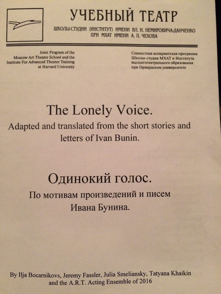 Throughout grad school, the dramaturgs would be assigned to work on plays that were either done on the mainstage of the A.R.T., or just faculty-directed productions starring the students. For my first year, I was assigned “The Russia Project” that the acting students would perform at MXAT. The previous year’s students had done a devised adaptation of The Brothers Karamazov; the students the year after us did Alexander Vvendensky’s play Christmas with the Ivanovs. Our project was an adaptation of the short stories of Nobel laureate Ivan Bunin that we called The Lonely Voice. The director was a MXAT faculty member named Ilya, who had sat in on our acting classes during our summer semester.