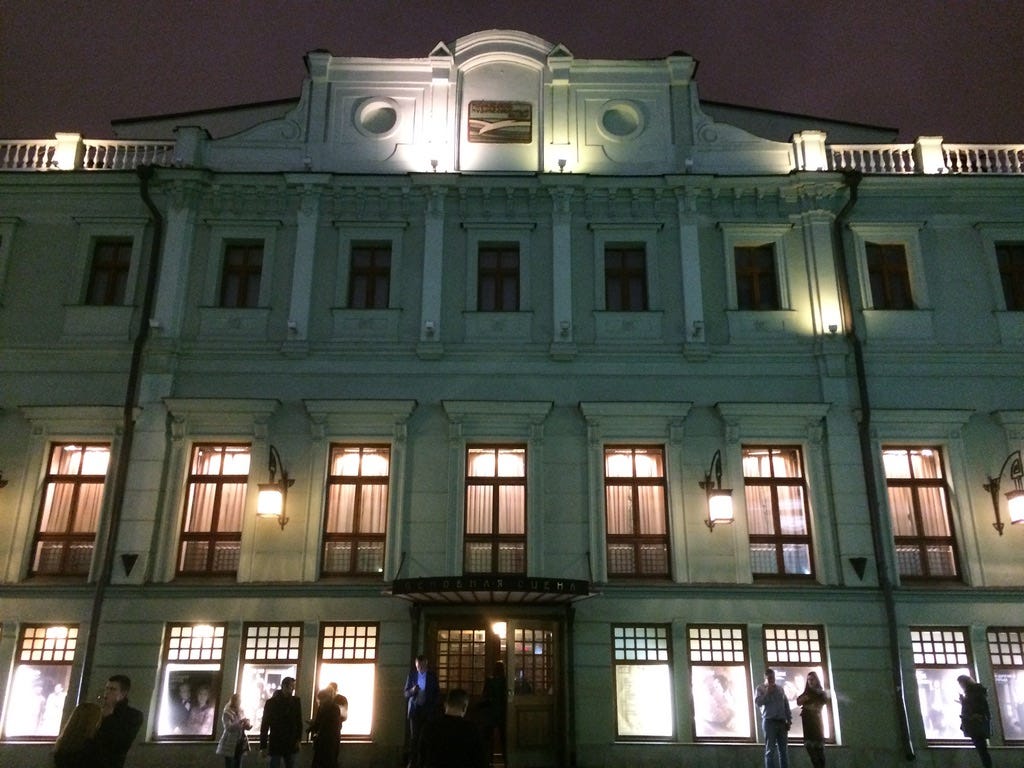 We sped down Tverskaya Street and pulled up to Kamergersky Pereoluk, the street where I would spend most of the next three months. Walking up to the MXAT for the first time, seeing the statues of founders Konstantin Stanislavsky and Vladimir Nemirovich-Danchenko, as well as the photograph on the side of the building of Chekhov and the original company members reading the script of The Seagull, I nearly burst into tears. This is where 20th century drama, modern acting, and the very concept of a repertory company all got started. I started crying. This is a common reaction – the French director Ariane Mnouchkine also broke down in tears the first time she came to the theater. If theater is the one place a secular person can have a religious experience, then MXAT is a temple.
