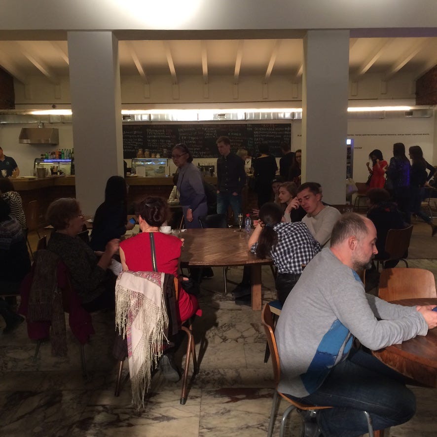 Kirill Sebrennikov, Dead Souls’ director, was then one of the rising stars of Russian theater and an innovator in theater space. At the time, he was the artistic director of the Gogol Center. Before he took it over in 2013, the Gogol Center had a reputation as the worst theater in Moscow. By the time I was there it was one of the best, not just because of his artistic programming but because he’d transformed the space into something akin to off-Broadway theaters like Signature and the New Studio on 42nd, with a café out front and an auditorium that could be reconfigured from proscenium to arena setting. I always took advantage of the café whenever I went, both to get work done and to mingle with other theatergoers.